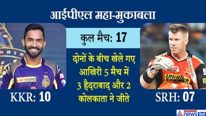 आंकड़ों की बात करें तो दिनेश कार्तिक की टीम कोलकाता आगे नजर आती है। दोनों के बीच अब तक 17 मैच खेले गए। इनमें से 10 में केकेआर ने जीत हासिल की। वहीं, हैदराबाद को 7 में जीत मिली। पिछले 5 मैच देखें तो हैदराबाद का पलड़ा भारी है। टीम ने 3 मैचों में जीत हासिल की। जबकि दो मैच केकेआर ने जीते।