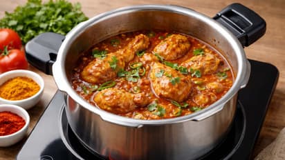 सबसे पहले, 500 ग्राम चिकन को अच्छी तरह धोकर एक तरफ रख दें। अब, प्रेशर कुकर को इंडक्शन स्टोव पर रखें और 2 बड़े चम्मच तेल डालें। जब तेल गरम हो जाए, तो एक बारीक कटा हुआ प्याज डालें और सुनहरा भूरा होने तक भूनें। फिर, अदरक-लहसुन का पेस्ट, टमाटर की प्यूरी, हल्दी पाउडर, लाल मिर्च पाउडर, धनिया पाउडर और नमक डालें। मसालों को अच्छी तरह भूनने के बाद, चिकन डालें और चलाते हुए 2–3 मिनट तक पकाएं।