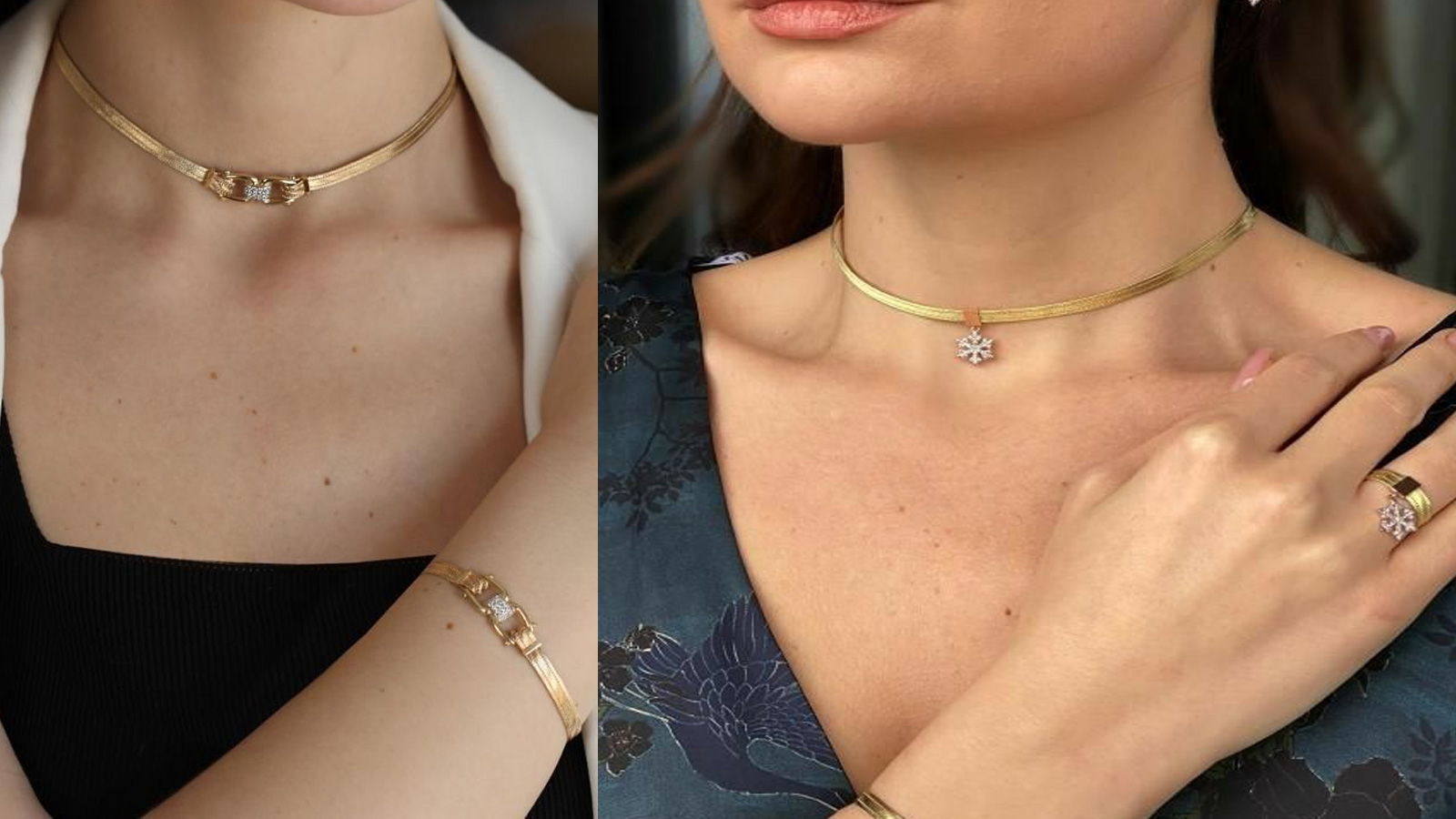 अगर आपको मॉर्डन लुक रखना है तो इस तरह के चोकर नेकलेस बनवा सकती हैं। चौड़े पट्टी वाले चेन के बीच में डायमंड जुड़ा होता है। इस तरह के डिजाइंस आपको 70 हजार के अंदर मिल जाएंगे, पर शर्त वहीं रहेगी 18 कैरेट। अगर आप 22 कैरेट में जाती है तो फिर खर्चा लाख के ऊपर बैठेगा।
