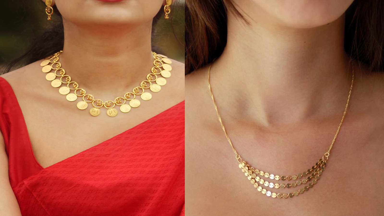 18 कैरेट में आप क्वाइन पेडेंट्स नेकलेस बनवा सकती हैं। 10 ग्राम के अंदर आप एक हैवी लुक वाला नेकलेस डिजाइन करा सकती हैं। कई शॉप पर तो सेम पैटर्न का डिजाइन अवेलेबल भी है। इसमें गोल्ड के छोटे-छोटे कॉइन्स एक लाइन में होते हैं। सिंपल लेकिन ट्रेडिशनल फील देने वाला यह डिजाइन हल्के वजन में आता है।