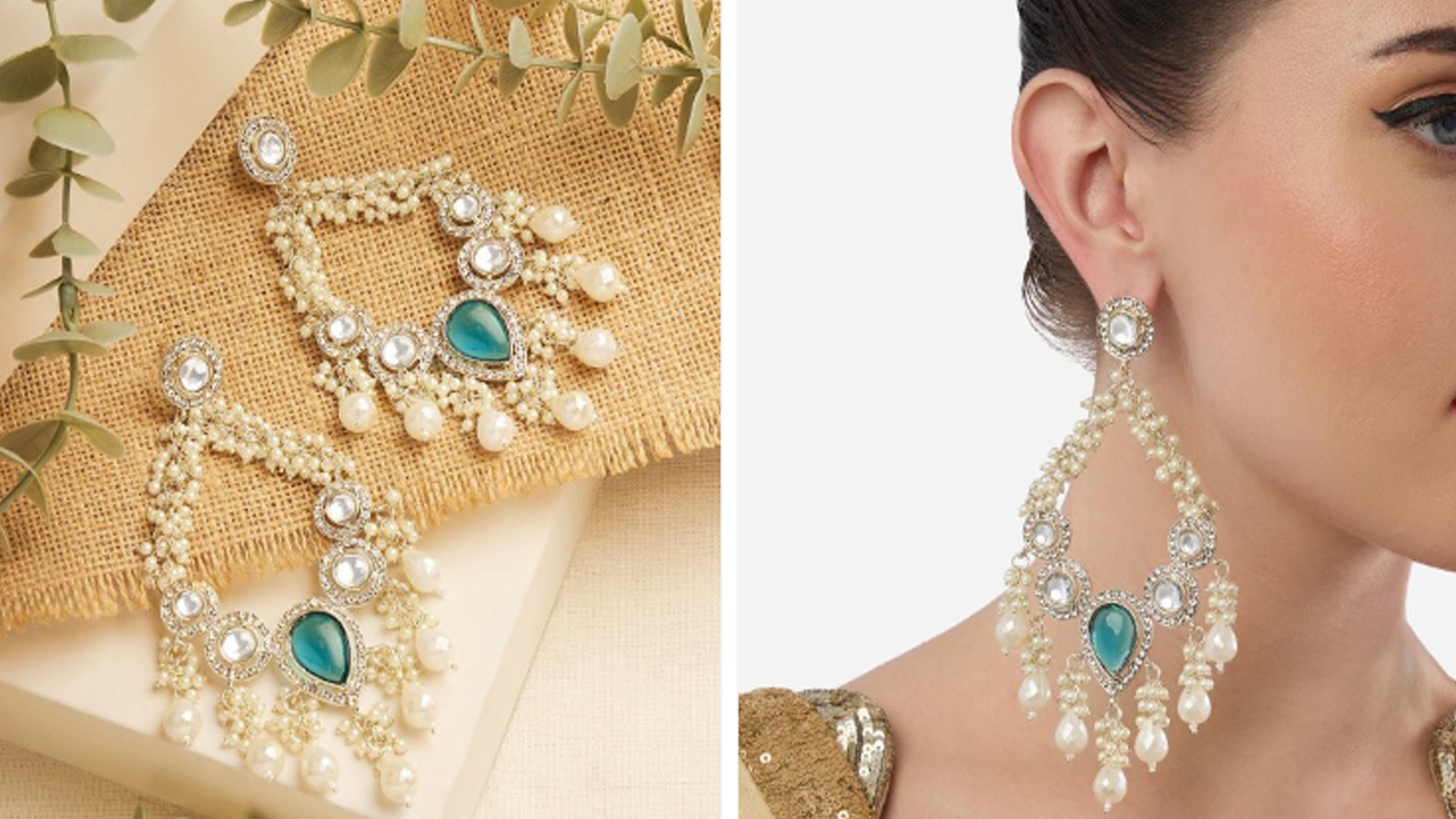 फेस्टिव लुक को और ग्रेसफुल बनाने के लिए साड़ी और लहंगे के साथ लॉन्ग और हैवी इयररिंग्स सबसे बेस्ट रहते हैं। इस बार अगर आप कुछ खास पहनना चाहती हैं, तो गोल्ड प्लेटेड कुंदन स्टड ड्रॉप इयररिंग्स ट्राई करें। ग्रीन स्टोन और पर्ल से सजी ये खूबसूरत इयररिंग्स आपको सिर्फ 415 रुपये में मिल जाएंगी।