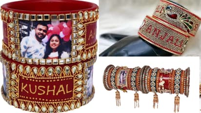 कपल के नाम और फोटो वाली चूड़ियों का यह सेट मॉर्डन और ट्रेडिशनल दोनों है। स्टोन जड़े ये अनोखे डिजाइन सबका दिल जीत लेते हैं। इन्हें इसलिए पसंद किया जाता है क्योंकि ये पहनने में आरामदायक होती हैं और प्लास्टिक या कांच की चूड़ियों की तरह इरिटेट नहीं करतीं। सिर्फ दुल्हन के लिए ही नहीं जन्मदिन, सालगिरह, सगाई, शादी, त्योहारों और फंग्शंस लिए बेस्ट हैं।