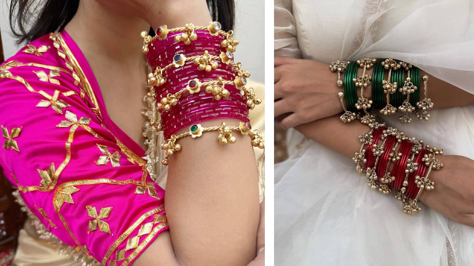 कांच की चूड़ियों के साथ हाथों में झंकार चाहिए, तो वह आप ग्लास घुंघरू बैंगल्स भी खरीद सकती हैं। यह आजकल लेटेस्ट डिजाइन में खूब पसंद किए जा रहे हैं। ऐसे बैंगल्स में कांच के साथ ही घुंघरू अटैच होते हैं, जो कि दिखने में काफी सुंदर लगते हैं। आप इसमें एक नहीं बल्कि कई रंग के घुंघरू बैंगल्स खरीद सकती हैं। इन्हें चाहे तो यू ही पहन लें या फिर साड़ी से मैच कराते हुए किसी एक रंग के बैगल्स खरीदें। आपको साथ में अलग से कोई बैंगल एड करने की जरूरत महसूस नहीं होगी।