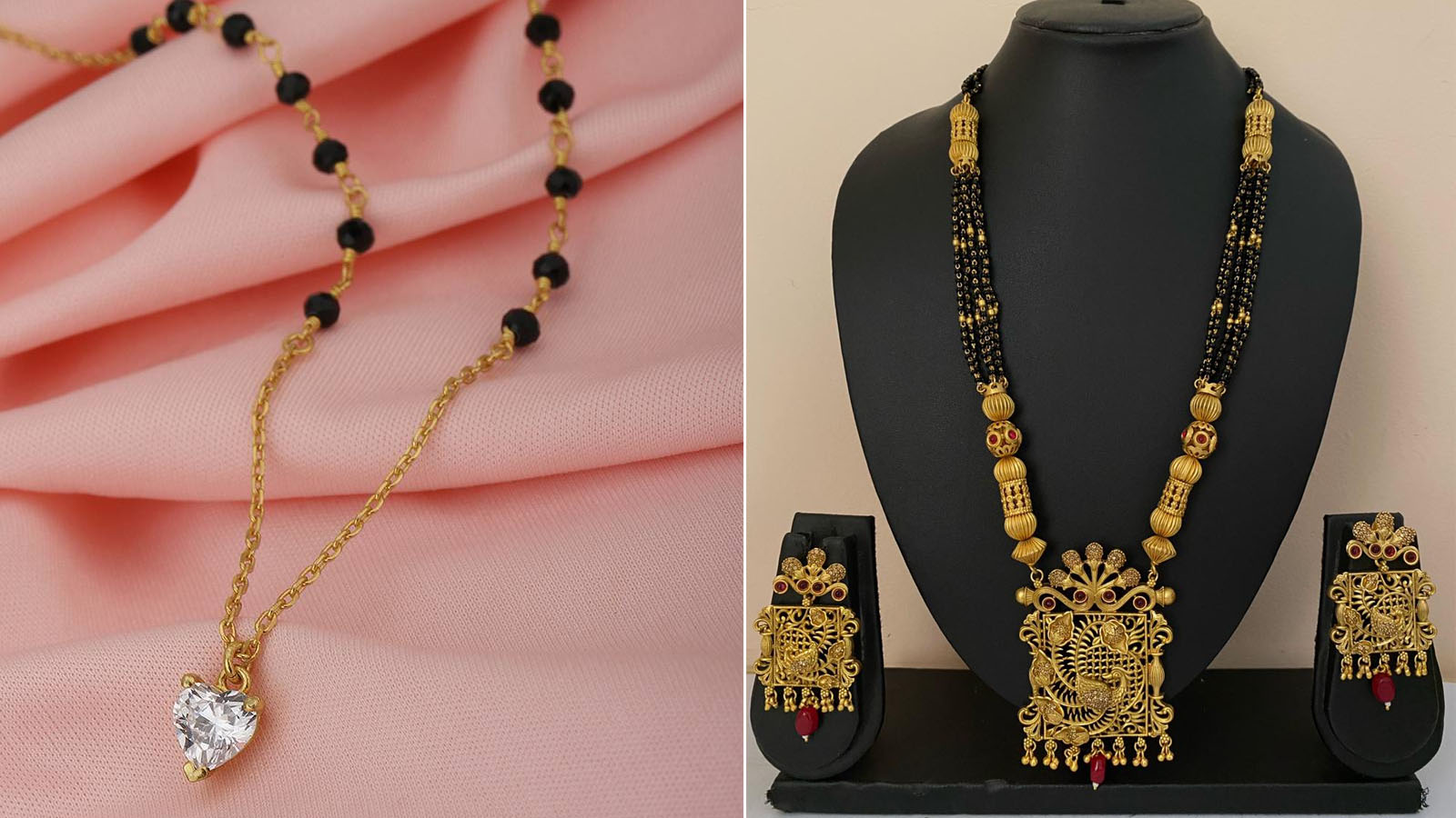 अगर आप कुछ ऐसा चाहती हैं जिसे रोज पहन सकें, चाहे ऑफिस जा रही हों या मार्केट तो यह सिंपल गोल्ड-प्लेटेड मंगलसूत्र एकदम परफेक्ट ऑप्शन है। इसमें ब्लैक बीड्स की दो पतली चेन होती हैं और बीच में छोटा सा गोल्ड प्लेटेड लॉकेट, जो 22KT गोल्ड जैसी चमक देता है। इसकी कोटिंग काफी टिकाऊ होती है और अच्छी क्वालिटी हो तो स्किन को भी सूट करती है। ऐसे डिजाइन ₹999 से ₹1299 के बीच मिल जाएंगे यानी कम बजट में क्लासिक डेली वियर मंगलसूत्र ऑप्शन है।