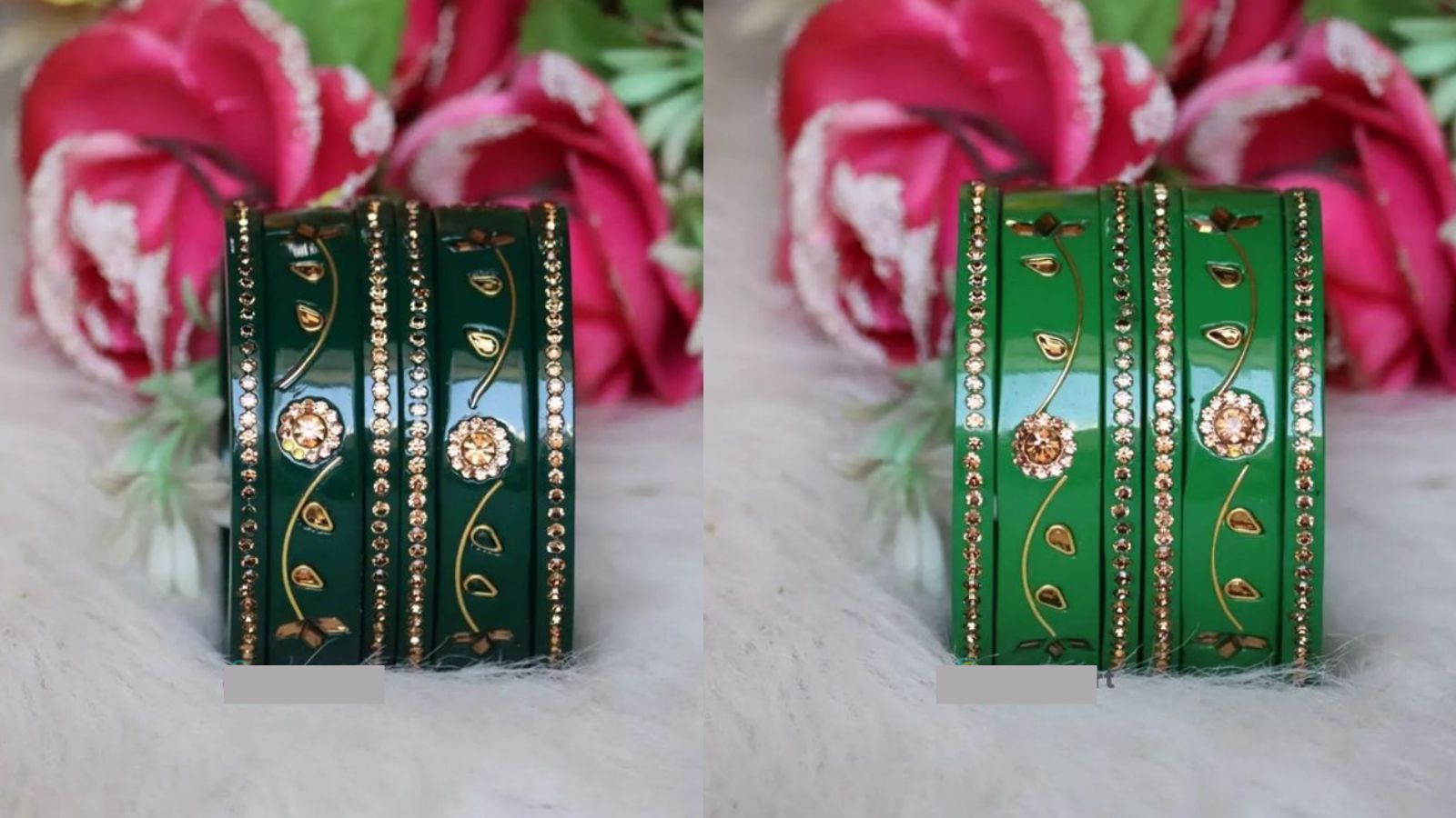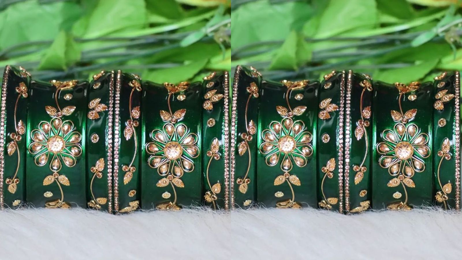गोल्डन वर्क वाली ये चूड़ी ब्राइडल वाइब दे रही है। ये लाख की चूड़ी उनके लिए बेहद खास और खूबसूरत है, जिनकी शादी को हुए मात्र साल दो साल ही हुए हैं। ग्रीन कलर के लाख की चूड़ी में ये गोल्डन स्टोन का काम इसे बेहद शानदार लुक दे रहा है।