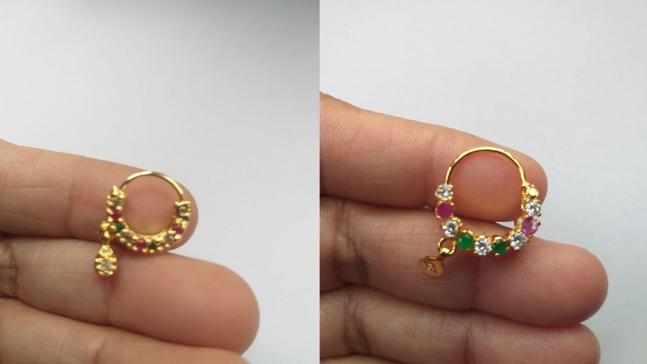 मल्टी कलर स्टोन के काम वाला ये हूप पैटर्न नोज रिंग आपके हर साड़ी और सूट के साथ मैच होगा। इस तरह का डिजाइनर पीस आपको 3 हजार में मिल जाएगा, आप चाहे तो बजट बढ़ाकर इसे बड़े साइज में भी ले सकती हैं, ये भी आपके चेहरे पर खूब जचेगा।
