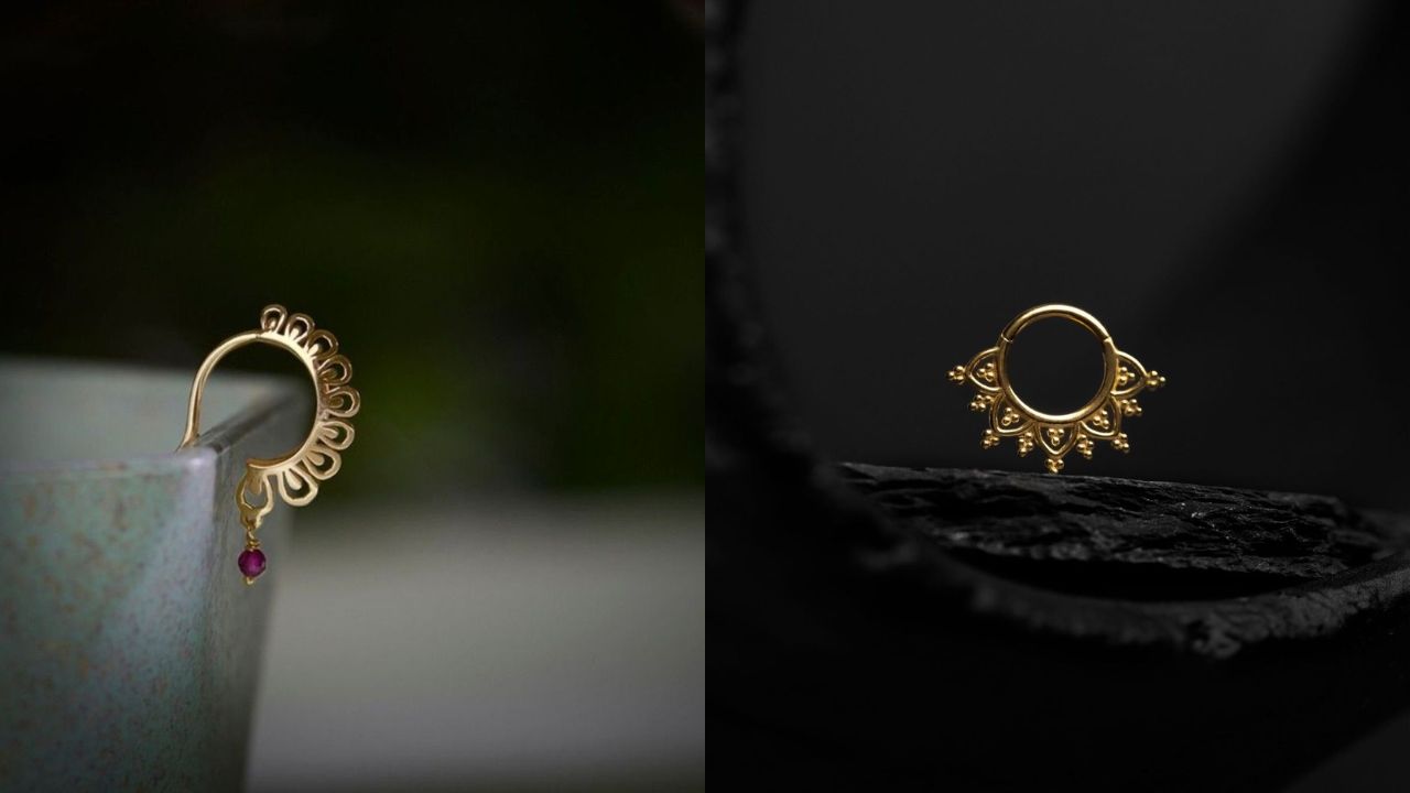 मिनिमल हूप पैटर्न में ये नोज रिंग छोटी है लेकिन गोल चेहरे पर खूब जचेगी, प्योर गोल्ड में बनी ये डिजाइन चेहरे की सुंदरता में चार चांद लगा देगी।