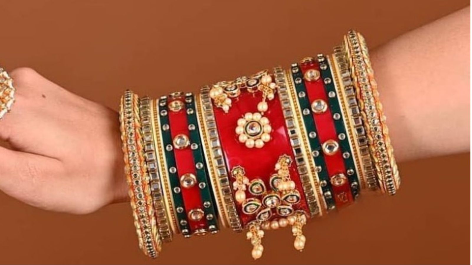 शादी के बाद पहली बार करवा चौथ का व्रत रखी रही हैं तो साड़ी के साथ लाल और हरे रंग पर ऐसा चूड़ी सेट चुन सकती हैं। यहां पर चूड़ियों के साथ मल्टीकलर गोल्डन बैंगल्स लगे हैं, जबकि बीच में मीनाकारी और पर्ल वर्क का बड़ा सा रजवाड़ी कंगन है, जो इसे और भी खूबसूरत लुक दे रहा है।