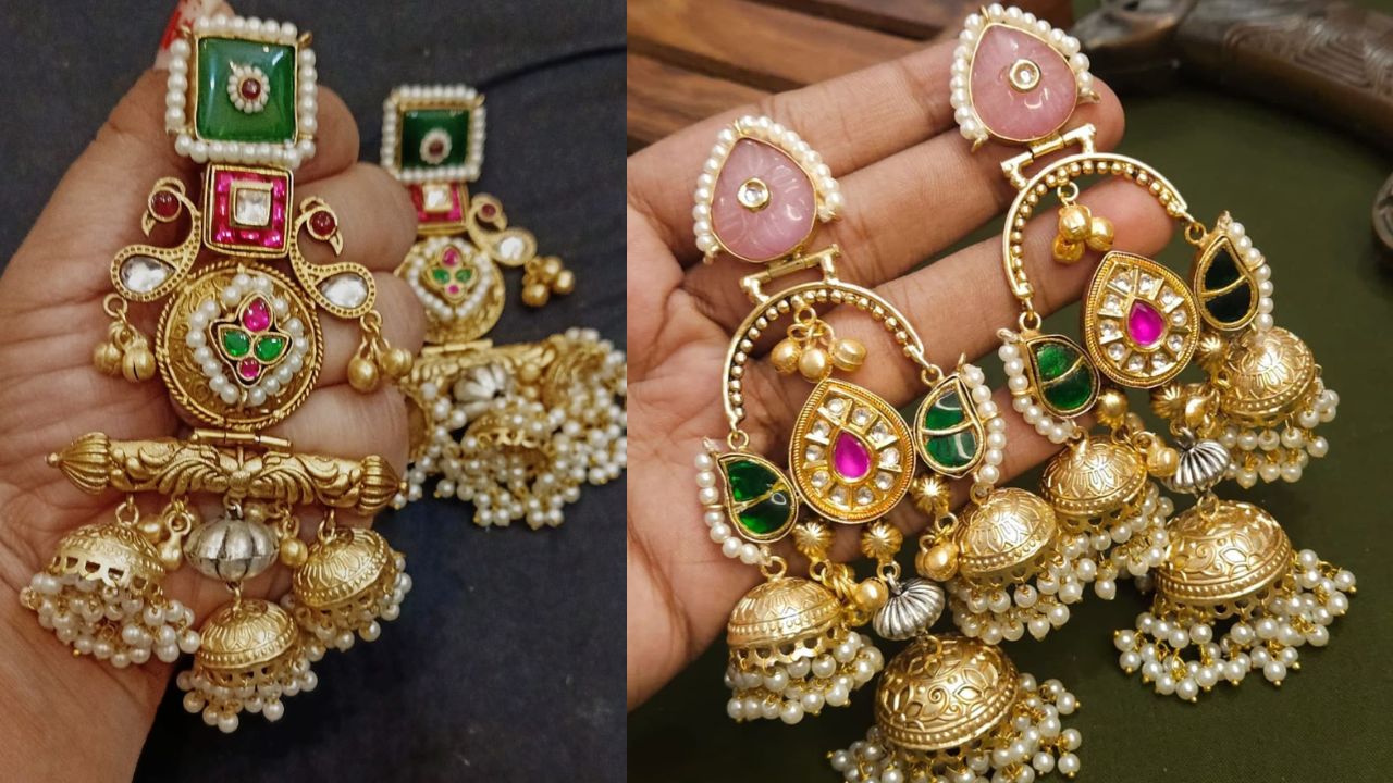 झुमकी वाली कश्मीरी ब्रास इयररिंग की ये डिजाइन इंस्टाग्राम में बहुत वायरल हो रही है। राखी में बनारसी, सिल्क और शरारा सूट के साथ ये इयररिंग जोरदार लगेगी। खूबसूरत गुलाबी और हरे रंग के कुंदन और मोती का बारीक काम झुमकी वाली इस ब्रास इयररिंग की सुंदरता में चार चांद लगा रही है।