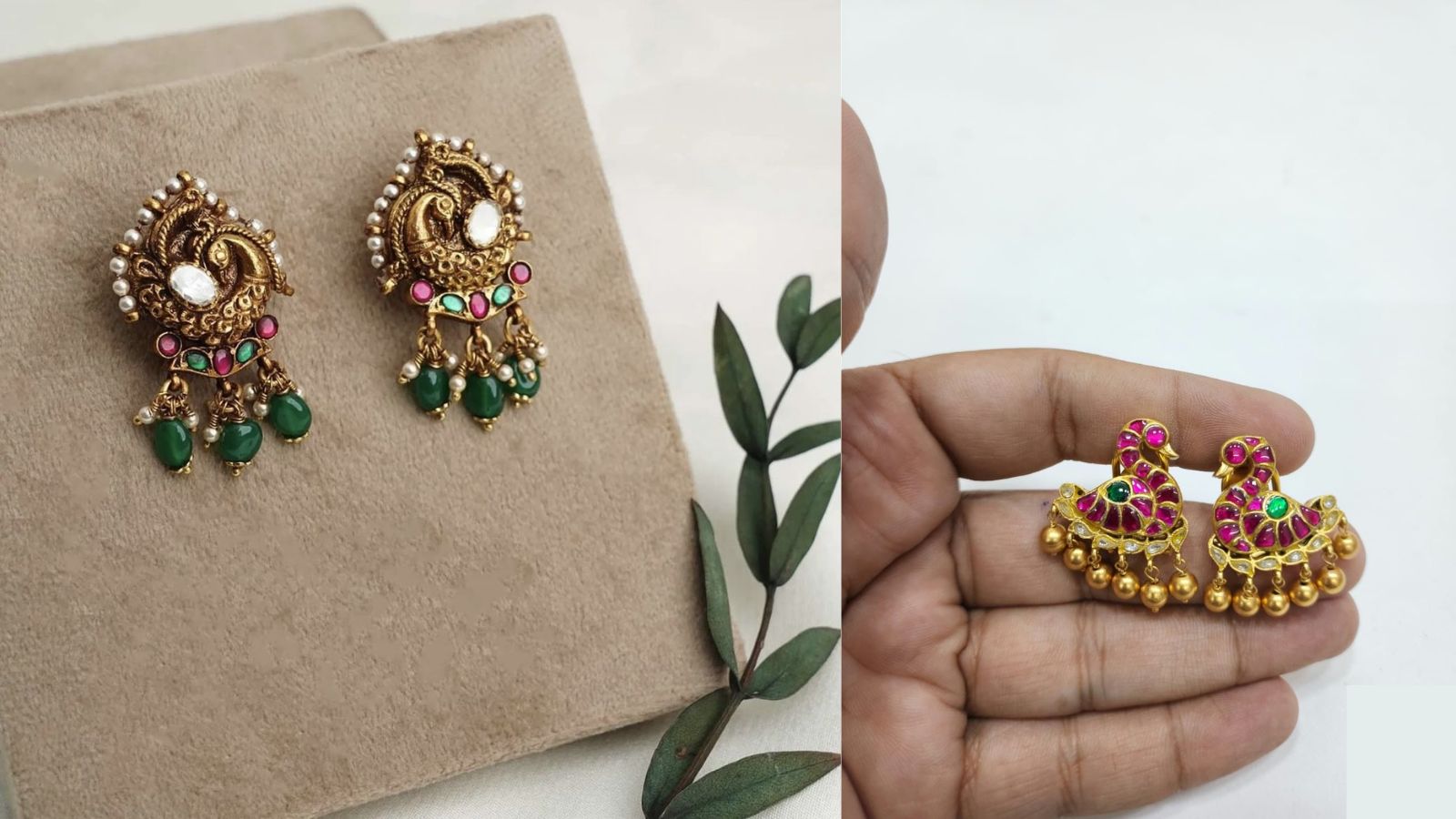 छोटे-छोटे मोराकृति वाली इयररिंग के ये डिजाइन एंटीक पॉलिश में मिल जाएगी। खूबसूरत मोर की कारीगरी इसकी सुंदरता को बढ़ा रही है, इसमें नग और मोती का काम इयररिंग की सुंदर बना रही है।