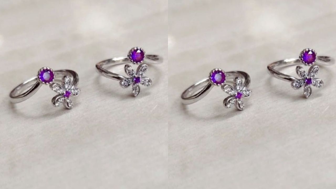 फ्लावर डिजाइन बिछिया में बहुत ही सुंदरता से पर्पल या वाइन स्टोन का काम हुआ है।