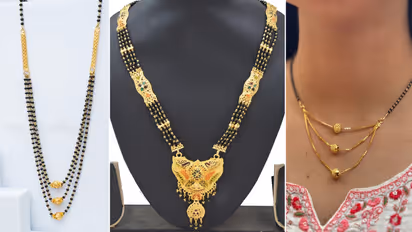 इस डिजाइन में तीनों लेयर सिंपल काली मनके (black beads) वाली चेन में होती हैं और बीच में गोल्ड पेंडेंट लगाया जाता है। पेंडेंट फ्लोरल, राउंड या स्टोन सेट जैसा किसी भी स्टाइल में बनवाया जा सकता है। ये डिजाइन डैली वियर के लिए सबसे मजबूत और प्रैक्टिकल माना जाता है।