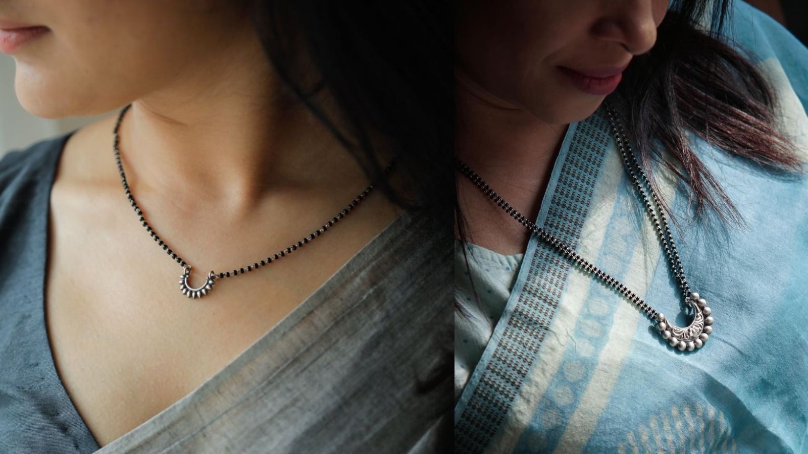 चांदी के मंगलसूत्र में ये हाफ मून पैटर्न में पेंडेंट के साथ ये आपको एस्थेटिक और स्टाइलिश लुक देगा। इस तरह के मंगलसूत्र डेली वियर और ऑफिस वियर के लिए ले सकती हैं। हाफ मून पैटर्न में आपको और बी कई डिजाइन मिलेंगे, जिसमें आप उसे प्योर चांदी के चेन या फिर काले मोती के साथ गूंथ कर भी पहन सकती हैं।