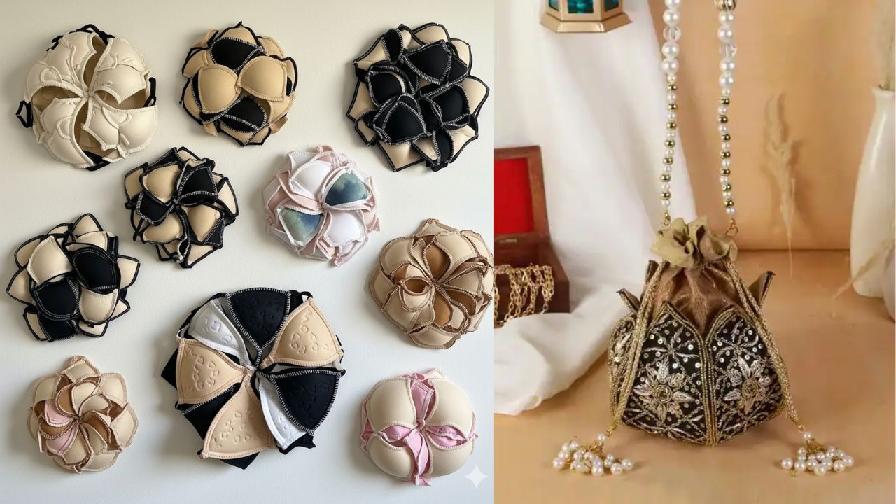 ब्रा कप्स से आप शानदार पोटली बैग भी तैयार कर सकती हैं। सबसे पहले नीचे के बेस के लिए कप्स को रखें और फैब्रिक से कवर करें। अब साइड को गोल शेप देने के लिए मोटा प्लास्टिक या फिर बकरम पेपर लें और उसे भी मैचिंग फैब्रिक से कवर करके बेस के साथ सिलाई कर लें। अब जोड़ को छिपाने के लिए लेस लगाएं और पोटली को खूबसूरत लुक देने के लिए बैग में स्टोन, मोती, लटकन के साथ बीड्स का दो हैंडल लगाएं। गरबा लुक के लिए होममेड पोटली रेडी है।