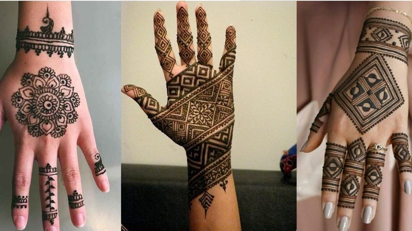इस डिजाइन में उंगलियों पर चौड़े बैंड पैटर्न बनाए जाते हैं और हथेली पर छोटे-छोटे स्क्वायर बॉक्स। अगर आप ऑफिस जाने वाली महिला हैं तो ये डिजाइन आपके लिए परफेक्ट है क्योंकि यह साफ, मिनिमल और जल्दी बनने वाला है।