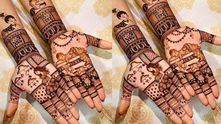 बैक हैंड पर आप इस तरह से बच्चों के फुटप्रिंट, कपड़े की डिजाइन मेहंदी से बनवाकर भी ट्रेंडी मेहंदी लगा सकती हैं और प्राउड मॉम और डैड बीच में लिखवाकर खूबसूरत सा मेहंदी लुक अपने हाथों को दें। मैटरनिटी फोटोशूट के दौरान इस तरह की मेहंदी हाथों पर बहुत ही खूबसूरत लगती हैं। तो आप भी अगर अपने बेबी शावर के लिए मेहंदी की तलाश में हैं, तो इन मेहंदी लुक्स को ट्राई कर सकते हैं।