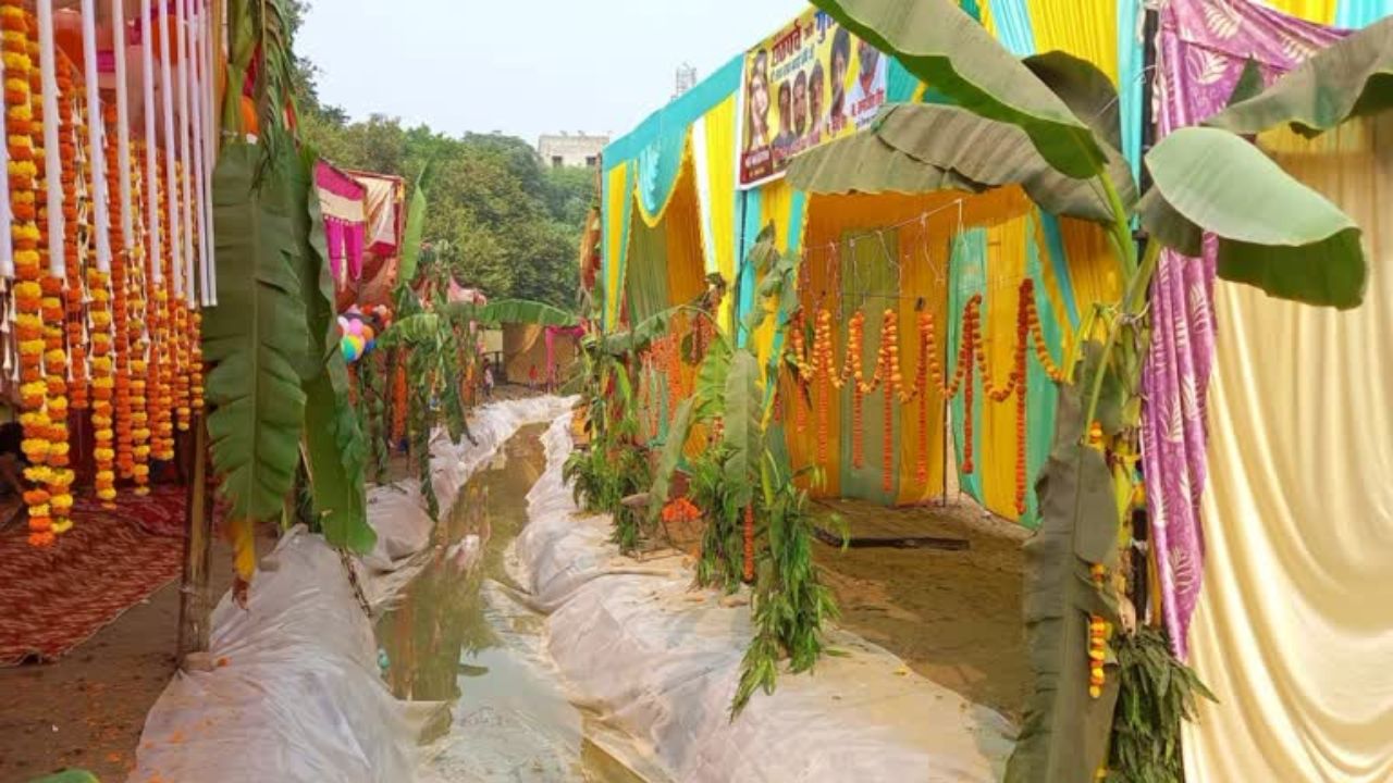 घाट की सुंदरता बढ़ाने के लिए चारों ओर केले के पेड़ को काटकर सजा सकते हैं। आप चाहें तो बैकग्राउंड में केले के पत्ते को भी काटकर डेकोरेट कर सकते हैं। केले के पत्ते के चारों खंभे में खूबसूरत पत्ते और फूल से बने तोरण और माला बनाकर घाट को पारंपरिक लुक दें।
