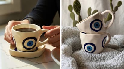 आजकल इविल आई का ट्रेंड बहुत ज्यादा बढ़ गया है। चाहे वो इंटीरियर हो, ज्वेलरी हो या फिर आपकी क्रॉकरी ही क्यों ना हो। इसमें एविल आई काफी ट्रेंड में है और आपको बुरी नजर से भी बचाता है। आप इस तरह से व्हाइट बेस में काफी मग के ऊपर इविल आई साइन बना हुआ पैटर्न चुन सकते हैं। इस तरह के कप आपको अमेजॉन, फ्लिपकार्ट, मिंत्रा या मीशो जैसी साइट पर 100 से 150 रुपए में मिल जाएंगे।
