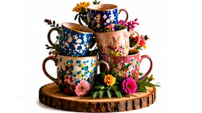 कई मग को एक के ऊपर एक सजाकर और उसमें फूल-पत्तियां जोड़कर आप एक यूनिक सेंटरपीस बना सकते हैं। यह डाइनिंग टेबल या पार्टी के लिए शानदार डेकोरेशन है।