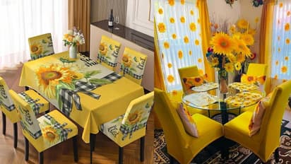 इस तरह की सनफ्लावर प्रिंट डाइनिंग टेबल और कुर्सी के कवर आपको आसानी से ₹500 में मिल जाएंगे। जिसमें कॉटन फैब्रिक येलो बेस कपड़े पर खूबसूरत सनफ्लावर के प्रिंट्स दिए गए हैं। आप इसी से मैच करते हुए कर्टन और डाइनिंग टेबल के बीच में सनफ्लावर का पॉट भी लगा सकते हैं।