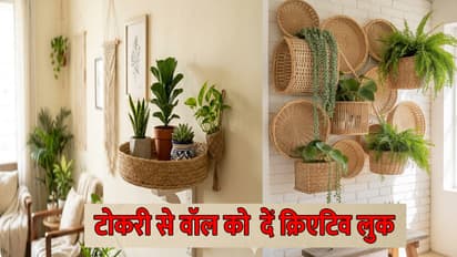 यह वॉल डेकोर डिजाइन बेहद यूनिक और नेचुरल वाइब देने वाला है, जिसमें अलग-अलग साइज की टोकरी को दीवार पर आर्टिस्टिक तरीके से सजाया गया है। इन टोकरी में छोटे-छोटे प्लांट्स रखकर ग्रीनरी का खूबसूरत टच दिया गया है, जो पूरे रूम को फ्रेश और क्लासी लुक देता है। साथ ही वुडन डेकोर पीस और नीचे रखे इंडोर प्लांट्स इस सेटअप को और ज्यादा एस्थेटिक बनाते हैं। यह डिजाइन खासकर उन लोगों के लिए परफेक्ट है, जो अपने घर में बजट फ्रेंडली और इको-फ्रेंडली डेकोर के जरिए स्टाइलिश बदलाव लाना चाहते हैं।