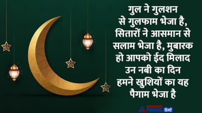 गुल ने गुलशन से गुलफाम भेजा है, सितारों ने आसमान से सलाम भेजा है, मुबारक हो आपको ईद मिलाद उन नबी का दिन हमने खुशियों का यह पैगाम भेजा है।
