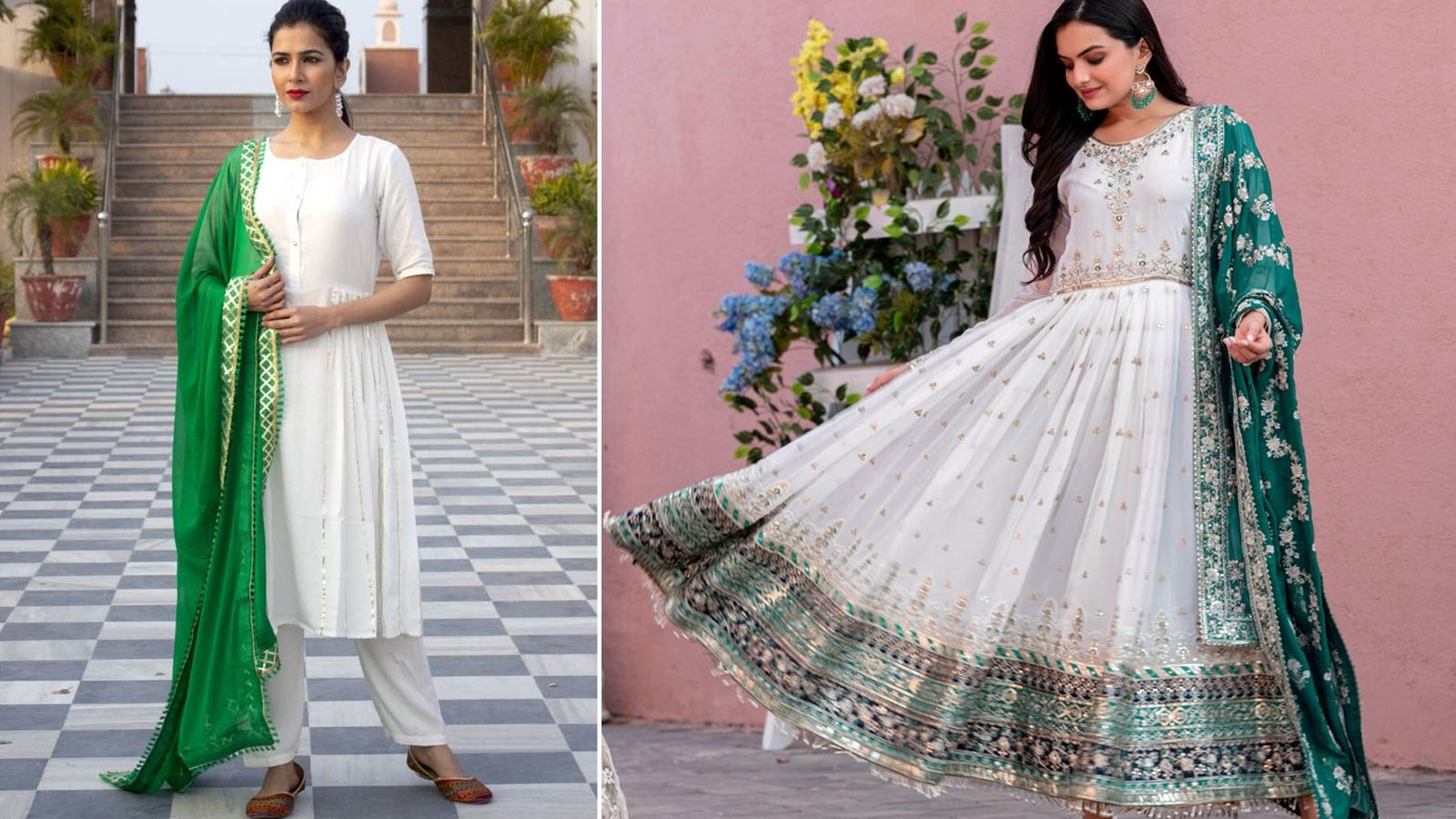 अगर आप सादगी और एलिगेंस का बैलेंस चाहती हैं तो व्हाइट कुर्ता-पैंट्स सेट के साथ ग्रीन दुपट्टा परफेक्ट है। यह मिनिमलिस्टिक लुक न केवल आपको मॉडर्न लगेगा बल्कि बेहद गरिमामयी भी दिखेगा। दुपट्टे में लाइट बॉर्डर या गोटा-पट्टी का टच इसे और खास बना सकता है।