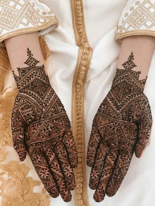 मोरक्कन मेहंदी की पहचान है डायमंड शेप (diamond shape) जिसमें बीच-बीच में डॉट्स और लाइन पैटर्न बने होते हैं। ये डिजाइन हथेली के बीच से शुरू होकर उंगलियों तक बनाई जाती है। इसमें छोटे-छोटे डायमंड पैटर्न को आपस में कनेक्ट कर एक जाल जैसा लुक दिया जाता है। यह सिंपल भी है और रॉयल भी। हरे रंग की चूड़ियों और सिल्क साड़ी के साथ यह डिजाइन हरियाली तीज पर जबरदस्त लगेगी।