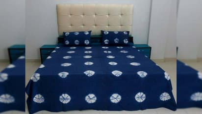 कॉटन फैब्रिक में बांधनी प्रिंट बेड शीट न केवल स्किन फ्रेंडली और गर्मियों में कंफर्टेबल होती है बल्कि बहुत ही प्लेजेंट लुक रूम को दे सकती है। आप इस तरह से ब्लू बेस में व्हाइट बड़े-बड़े बांधनी प्रिंट वाले डिजाइन की बेड शीट चुन सकते हैं। इस तरह की बेडशीट आपको आसानी से 500 से ₹600 में मिल जाएगी।
