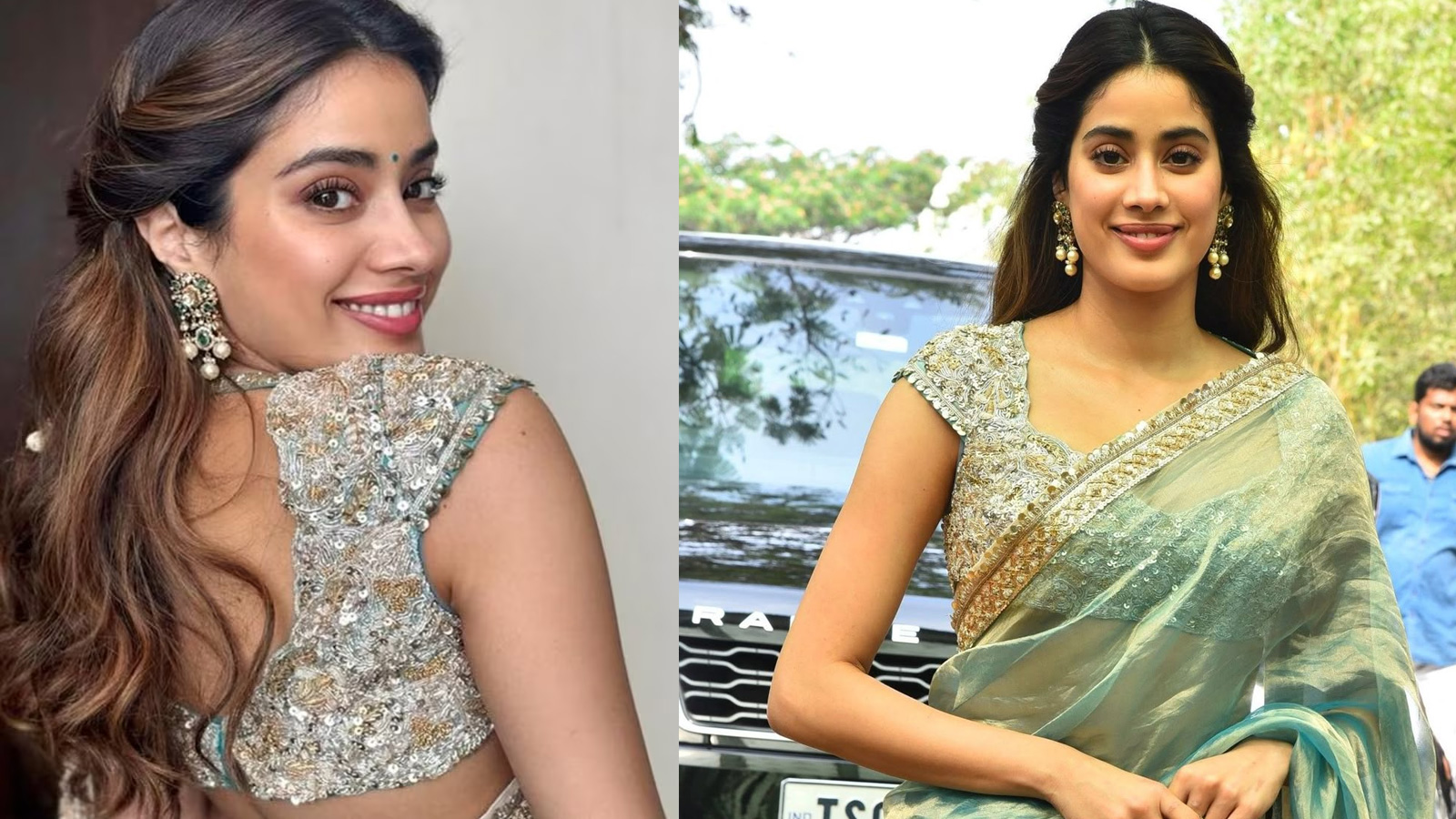 अगर ट्रेडिशनल के साथ मॉडर्न लुक चाहती हैं, तो जाह्नवी का यह ब्लाउज परफेक्ट है। फ्रंट में डीप नेकलाइन दी गई है, जबकि बैक को पूरी तरह ओपन रखा गया है। बीच-बीच में पर्ल डोरी से इसे स्टाइल किया गया है। टिशू साड़ी के साथ हैवी वर्क ब्लाउज जोड़कर उन्होंने एक खूबसूरत लुक क्रिएट किया है।