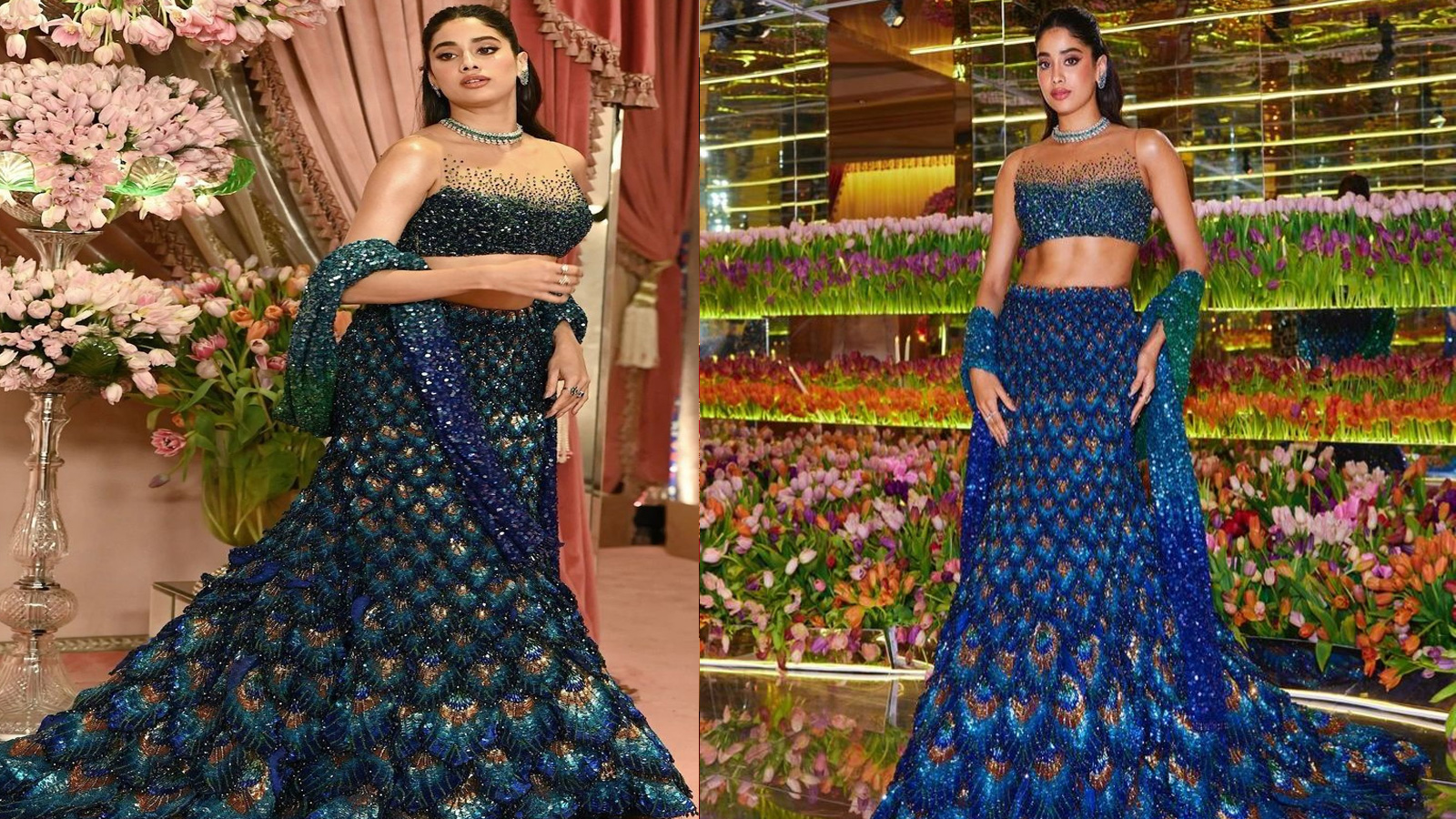 बोनी कपूर की बड़ी बेटी जाह्नवी ने पीककॉक इंस्पार्यड हैवी सीक्विन वर्क नीला-हरा लहंगा पहना है। इसमें वो रॉयल और ग्लैमरस लुक दे रही हैं। एक्ट्रेस ने लहंगा के साथ स्ट्रैपलेस ब्लाउज और ग्लिटर वर्क दुपट्टा जोड़ा है। खास मौके लिए यह परफेक्ट लहंगा डिजाइन है।