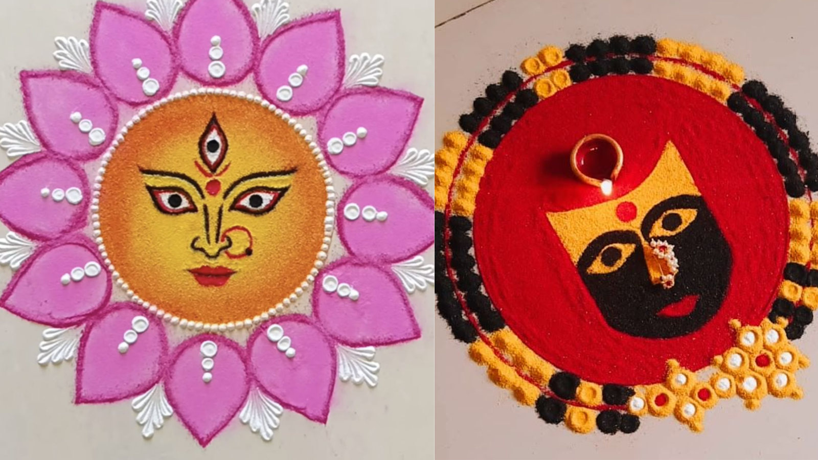 बंगाल में काली चौदस धूमधाम से मनाया जाता है। आप भी मां देवी का चेहरा रंगोली में उकेर सकती हैं। ये बहुत खूबसूरत लगता है। यहां पर दो अलग-अलग रंगों से खूबसूरत डिजाइन बनाई गई है।
