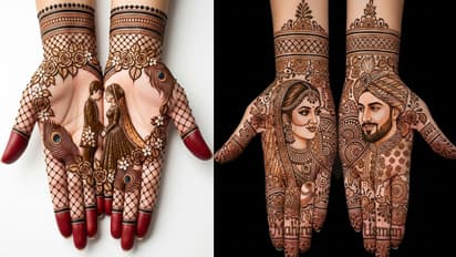 ऊपर दिखाए गए दोनों मेहंदी डिजाइंस बेहद ट्रेंडी, मॉडर्न और मिनिमल ब्राइडल लुक के लिए परफेक्ट हैं। इनका फोकस दूल्हा-दुल्हन की प्यारी तस्वीरों और साफ-सुथरे पैटर्न्स पर है, जो मेहंदी को एक स्टोरीटेलिंग टच देता है। आप भी कुछ इस तरह का यूनकि और एलीगेंस से भरा मेहंदी डिजाइंस अपने खास दिन पर लगवा सकती हैं।