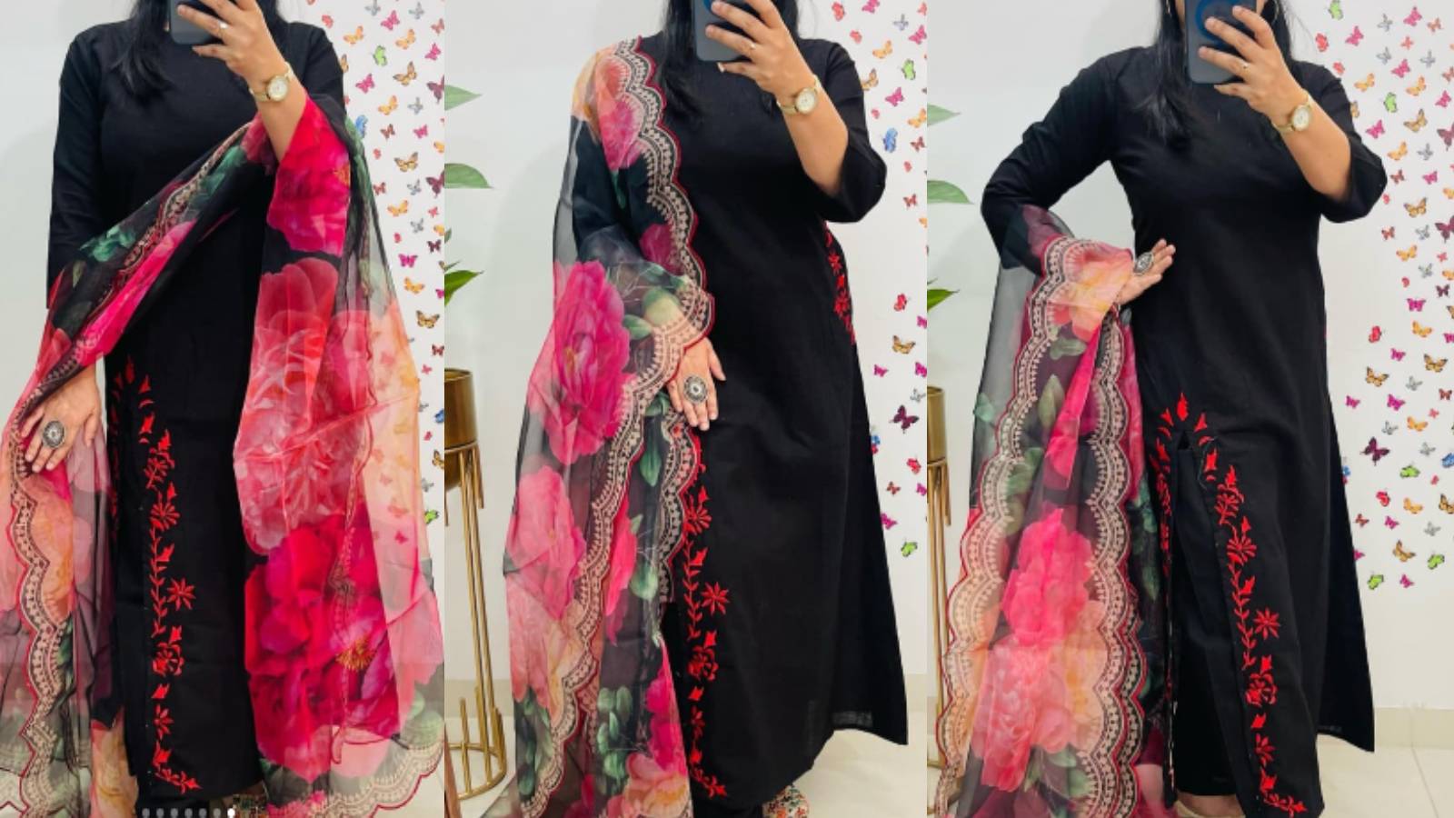 यह सूट शादीशुदा महिलाओं के लिए रोज़ाना पहनने के लिए परफेक्ट है। अगर आप सिंपल लेकिन ग्रेसफुल लुक चाहती हैं, तो बनारसी, फुलकारी, या हैवी नेट दुपट्टे के साथ प्लेन ब्लैक सूट पहनें। यह कॉम्बिनेशन कम मेहनत में शानदार लुक देता है।
