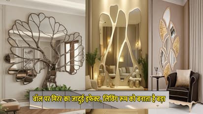 यहां पर जियोमेट्रिक मिरर के दो पैटर्न दिखाए गए हैं। गोल और हेक्सागन शेप के कई छोटे-बड़े मिरर को एक साथ क्लस्टर स्टाइल में लिविंग रूम के सामने या बैक वॉल पर लगाएं। अगर साइड वॉल दरवाजे के सामने हैं, तो आप वहां भी इसे लगा सकती हैं। वॉल पर मिरर लगाने से कमरा ज्यादा बड़ा व ब्राइट दिखाई देता है। गोल्डन फ्रेम वाले ये मिरर वॉल डेकोर को रॉयल टच देते हैं और खासतौर पर छोटे लिविंग रूम या 10x10 फीट स्पेस में भी हॉल जैसा ओपन और स्टाइलिश लुक क्रिएट करते हैं।