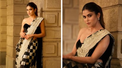 ब्लैक और व्हाइट बॉक्स की साड़ी डिजाइन को चेक बोर्ड साड़ी के नाम से जाना जाता है। अब तक आपने जॉर्जेट या शिफॉन की ऐसी चेक बॉक्स वाली साड़ी देखी होगी। लेकिन अदिति ने साटन फैब्रिक में बेहद खूबसूरत साड़ी पहनी है। साड़ी की खासियत इसमें किया गया महीन वर्क है। बॉर्डर को सिल्वर गोटा पट्टी से सजाया गया है, जो कि दिखने में काफी हैवी लुक दे रहा है। आप ऐसी साड़ी को ऑफ शोल्डर ब्लाउज के साथ पहनकर बेहद खास दिख सकती है।