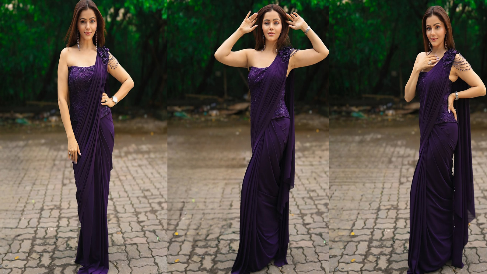 रुबीना दिलैक ने पर्पल साड़ी को बेहद खूबसूरती से स्टाइल किया है। पल्लू को उन्होंने पारंपरिक तरीके से अलग, एक साथ समेटकर लिया है। इसके साथ उन्होंने ऑफ-शोल्डर कोर्सेट ब्लाउज पहना है, जिससे उनका फिगर खूबसूरती से फ्लॉन्ट हो रहा है। एक्ट्रेस ने बालों को खुला रखा और इयररिंग्स के साथ लुक को कंप्लीट किया है। चाहें तो आप भी इस तरह की साड़ी और ब्लाउज के साथ हैवी नेकलेस जोड़कर लुक को और रॉयल बना सकती हैं।