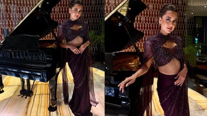 तेजस्वी की डार्क पर्पल साड़ी ब्राइटनेस और पॉजिटिविटी से भरपूर है। उन्होंने इसे स्टाइलिश ब्लाउज के साथ पहना है। यह लुक गर्मियों की शादी या दिन के फंक्शन के लिए आइडियल है।