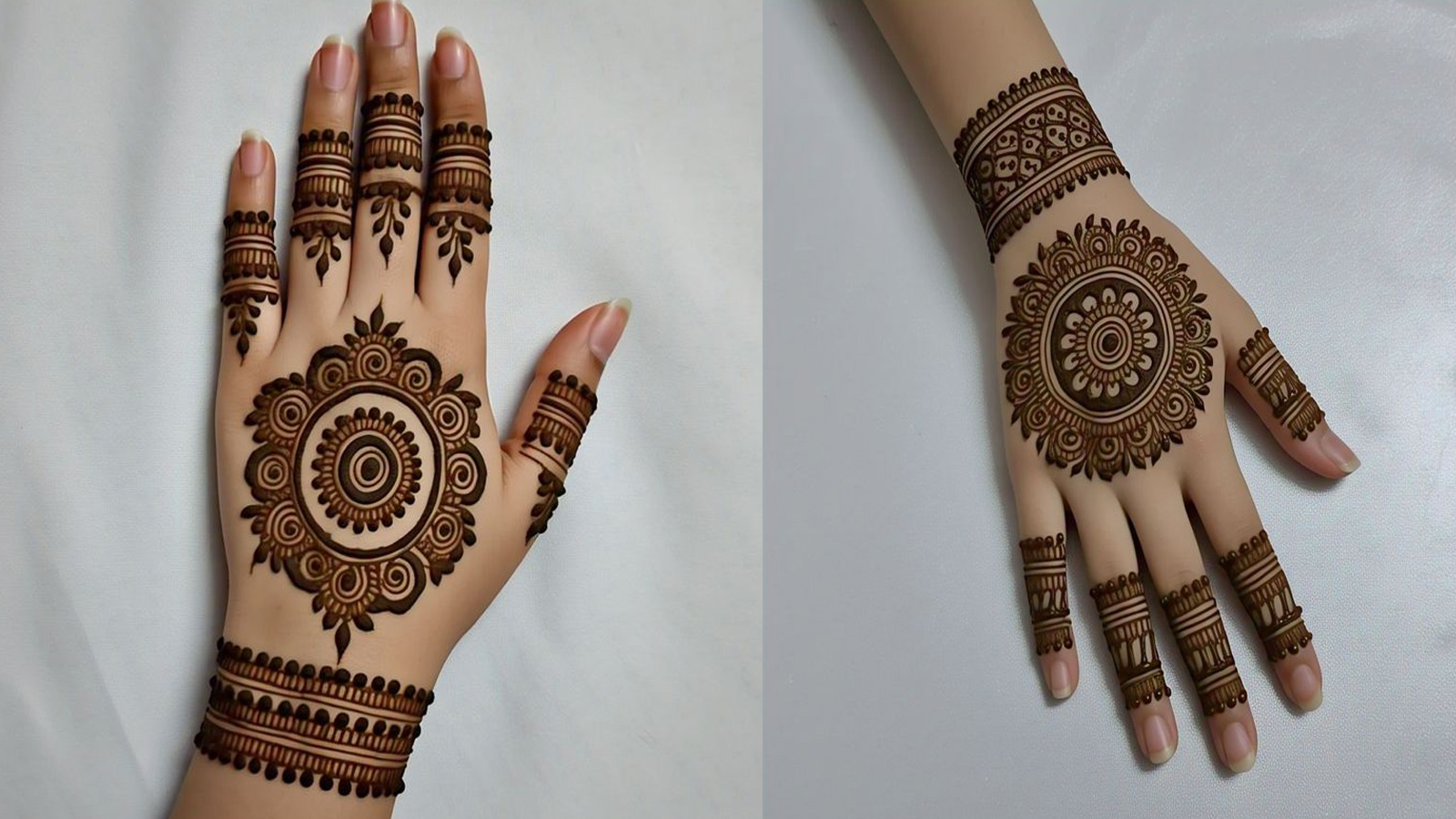 अगर आपको फुल हैंड मेहंदी डिजाइंस लगाना नहीं पसंद है तो राउंड शेप डिजाइन देख सकती हैं। कलाई को कवर करते हुए आप हथेली के बीच में इस पैटर्न की मेहंदी देख सकती हैं। इस तरह के डिजाइंस अगर आप खुद बनाने वाली है तो गोला बनाने के लिए छोटी सी चूड़ी का इस्तेमाल कर सकती हैं ताकि शेप परफेक्ट बनें।