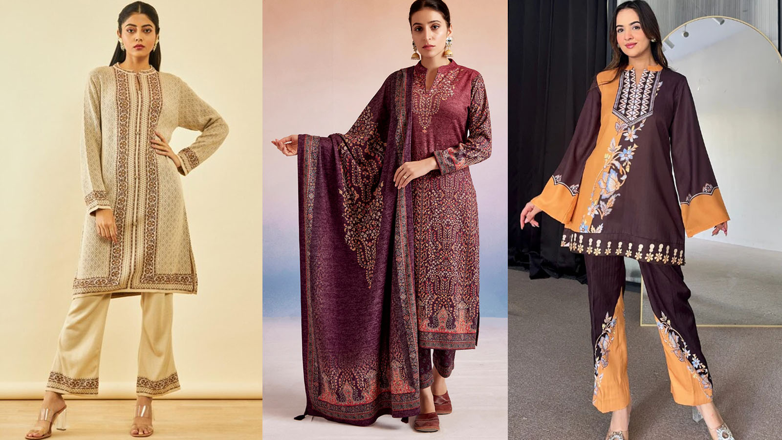 स्ट्रेट कुर्ते में थोड़ा फ्लो लाना चाहती हैं तो ए-लाइन स्टाइल ट्राई करें। सॉफ्ट वूलन फैब्रिक में लेस बॉर्डर वाला कुर्ता सेट आपकी फेमिनिन साइड को उभार देगा। यह डिजाइन उन महिलाओं के लिए परफेक्ट है जो सिम्पल लेकिन एलिगेंट लुक पसंद करती हैं।