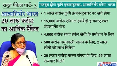 नई दिल्ली. वित्त मंत्री निर्मला सीतारमण ने शुक्रवार को आत्म निर्भर भारत के तहत दिए गए 20 लाख करोड़ के आर्थिक पैकेज की तीसरी किस्त का ऐलान किया। वित्त मंत्री ने बताया कि तीसरे दिन कृषि और इन्फ्रास्ट्रक्चर के लिए ऐलान होंगे। आज 11 कदमों का ऐलान किया जाएगा। उन्होंने बताया कि आज 11 घोषणाएं की जाएंगी। इसमें से 8 इन्फ्रास्ट्रक्चर को मजबूत करने, क्षमता बढ़ाने और बेहतर लॉजिस्टिक्स से संबंधित हैं, बाकी 3 शासन और प्रशासनिक सुधारों से संबंधित हैं।