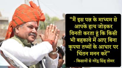 नरेंद्र सिंह तोमर ने लिखा, देश का कृषि मंत्री होने के नाते, मेरा कर्तव्य है कि हर किसान का भ्रम दूर करूं। हर किसान की चिंता दूर करूं। मेरा दायित्व है कि सरकार और किसानों के बीच दिल्ली और आसपास के क्षेत्र में जो झूठ की दीवार बनाने की साजिश रची जा रही है उसकी सच्चाई और वस्तुस्थिति आपके सामने रखूं।