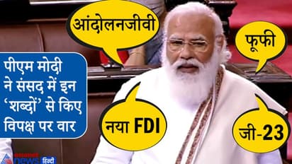 नई दिल्ली. प्रधानमंत्री नरेंद्र मोदी ने सोमवार को राज्यसभा में संबोधन दिया। इस दौरान वे अपने पुराने अंदाज में नजर आए। 77 मिनट के अपने भाषण के दौरान पीएम मोदी ने कुछ नए शब्दों का इस्तेमाल कर विपक्ष पर वार किया। पीएम मोदी ने अपने भाषण में आंदोलनजीवी, फॉरेन डिस्ट्रक्टिव आइडियोलॉजी, फूफी नाराज और जी-23 जैसे शब्दों का इस्तेमाल कर विपक्ष पर निशाना साधा। आईए जानते हैं कि इन शब्दों का इस्तेमाल पीएम मोदी ने किस तरह से किया।