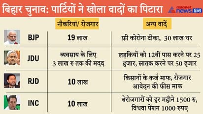 पटना. बिहार विधानसभा चुनाव के लिए 28 अक्टूबर से 7 नवंबर तक तीन चरणों में चुनाव है। इससे पहले जनता को रिझाने के लिए सभी राजनीतिक पार्टियों ने वादों की लंबी चौड़ी झड़ी लगा दी है। बिहार में कोई राजनीतिक पार्टी 10 लाख नौकरियां देने की बात कर रहे तो कोई कोरोना का मुफ्त टीका देने का वादा कर रहा है। आईए जानते हैं कि भाजपा, जदयू, कांग्रेस और एलजेपी ने अपने घोषणापत्र में क्या क्या वादे किए।