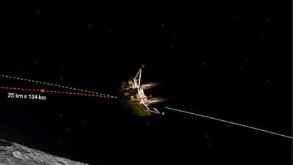 चंद्रयान तीन का विक्रम लैंडर चंद्रमा का चक्कर काट रहा है। उसका निकटतम बिंदु 25 किमी और सबसे दूर 134 किमी है।