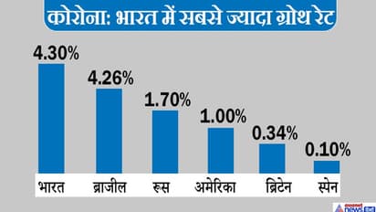 भारत में टॉप 6 देशों में कोरोना केसों के मामले में ग्रोथ रेट सबसे ज्यादा है। यहां संक्रमितों की संख्या 4.3% तक पहुंच गई है। जबकि ब्राजील में  4.26% की ग्रोथ रेट है।  सबसे कम ग्रोथ रेट स्पेन का है। यहां संक्रमितों की संख्या 0.10% की दर से बढ़ रही है। ये आंकड़े WHO यानी, विश्व स्वास्थ्य संगठन ने जारी किए हैं।