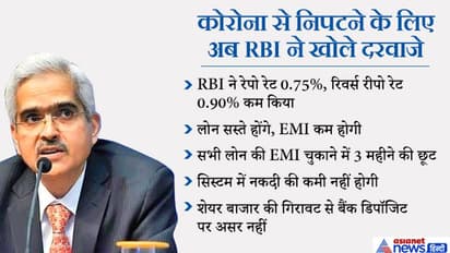 - गवर्नर ने बताया, RBI ने रेपो रेट में 75 बेसिस पॉइंट की कटौती की। यह 5.15 से घटाकर 4.45 की गई। वहीं, रिवर्स रेपो रेट में भी 90 बेसिस पॉइंट की कटौती करते हुए 4 प्रतिशत कर दी है। इससे लोगों की EMI कम होगी। उन्होंने बैंक को निर्देश दिया कि वे सुनिश्चित करें कि लोगों के पास कैश की कमी ना हो।
