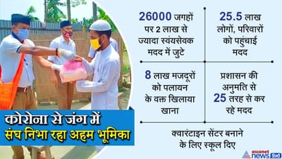 संघ के सह सरकार्यवाह डॉ. मनमोहन वैद्य और अधिकारियों से मिली जानकारी के मुताबिक, आरएसएस के कार्यकर्ता जरूरत के मुताबिक काम कर रहे हैं, जैसे कहीं, सैनिटाइजेशन करने की जरूरत है तो वहां मदद कर रहे हैं। जैसे कहीं फूड पैकेट बांटने की जरूरत है, तो फूड पैकेट बांट रहे हैं। जहां राशन बांटने की जरूरत हैं वहां राशन बांट रहे हैं।