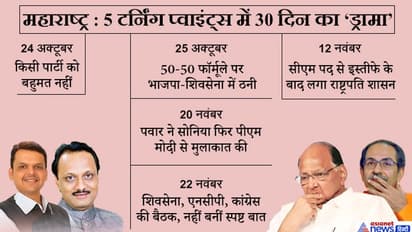 मुंबई. महाराष्ट्र में 30 दिनों से चल रहे सियासी ड्रामे में शनिवार की सुबह बड़ा बदलाव दिखा। सुबह-सुबह खबर आई कि देवेंद्र फड़णवीस ने सीएम पद की शपथ ली और एनसीपी नेता अजित पवार डिप्टी सीएम बने हैं। 30 नवंबर तक बहुमत साबित करना है। लेकिन शपथ ग्रहण के बाद भी सियासी ड्रामा थमा नहीं है। भाजपा की सरकार गिराने और बहुमत साबित न हो, इसके लिए तीनों दल (शिवसेना, एनसीपी, कांग्रेस) पूरी कोशिश कर रहे हैं। मीटिंग का दौर जारी है। ऐसे में बताते हैं चुनाव परिणाम और उसके बाद की वो 5 तारीखें, जो महाराष्ट्र की सियासत में टर्निंग प्वाइंट साबित हुईं।