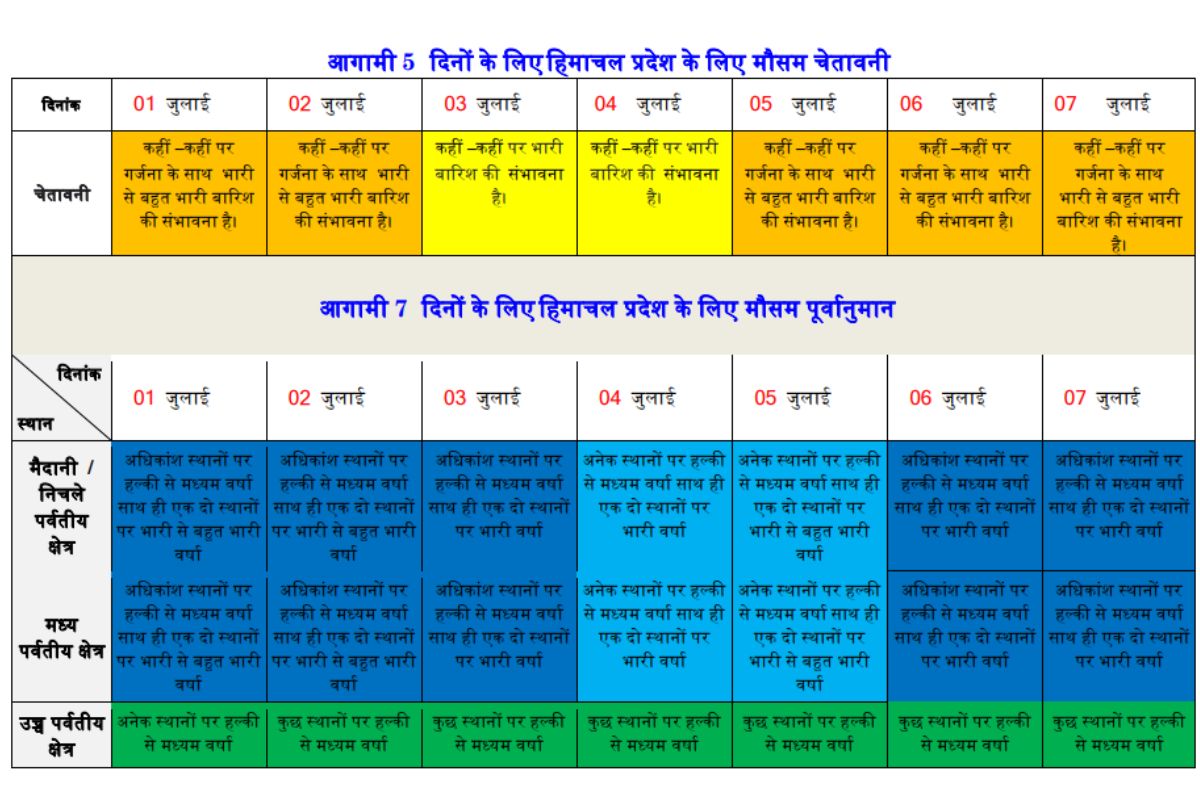 हिमाचल प्रदेश में मौसम विभाग ने पांच दिनों के लिए भारी बारिश को लेकर चेतावनी जारी की है। 1 जुलाई से 7 जुलाई तक राज्य के विभिन्न क्षेत्रों में कहीं-कहीं गर्जना के साथ भारी से बहुत भारी बारिश की संभावना जताई गई है। 1 और 2 जुलाई को प्रदेश के कई हिस्सों में तेज गर्जना के साथ मूसलधार बारिश हो सकती है। वहीं, 3 और 4 जुलाई को भी कुछ स्थानों पर भारी बारिश का अनुमान है। 5 जुलाई को भी इसी तरह के हालात बने रहेंगे और कुछ इलाकों में तेज बारिश हो सकती है। 6 और 7 जुलाई को फिर से गर्जना के साथ भारी से बहुत भारी बारिश की चेतावनी दी गई है।